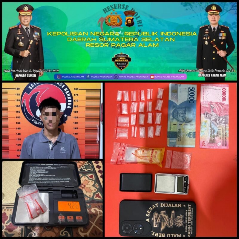 mitramabes.com Pagaralam– Upaya kepolisian dalam memberantas peredaran narkoba di Kota Pagar Alam kembali membuahkan hasil. Satuan Reserse Narkoba (Satresnarkoba) Polres Pagar Alam berhasil mengungkap kasus penyalahgunaan narkotika dengan menangkap seorang pemuda berinisial M Moris bin Rolesmon (23) di kontrakannya di Jalan Taman Siswa, Kelurahan Sukorejo, Kecamatan Pagar Alam Utara, pada Rabu malam (22/10/2025).