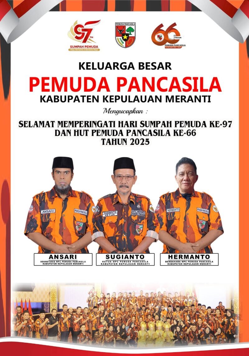 Dengan tema “Majukan Indonesia, Bersatu dalam Karya”, peringatan Hari Sumpah Pemuda ke-97 dan HUT Pemuda Pancasila ke-66 tahun ini menjadi simbol semangat kebersamaan, pengabdian, dan komitmen organisasi dalam membangun Kepulauan Meranti yang lebih baik.