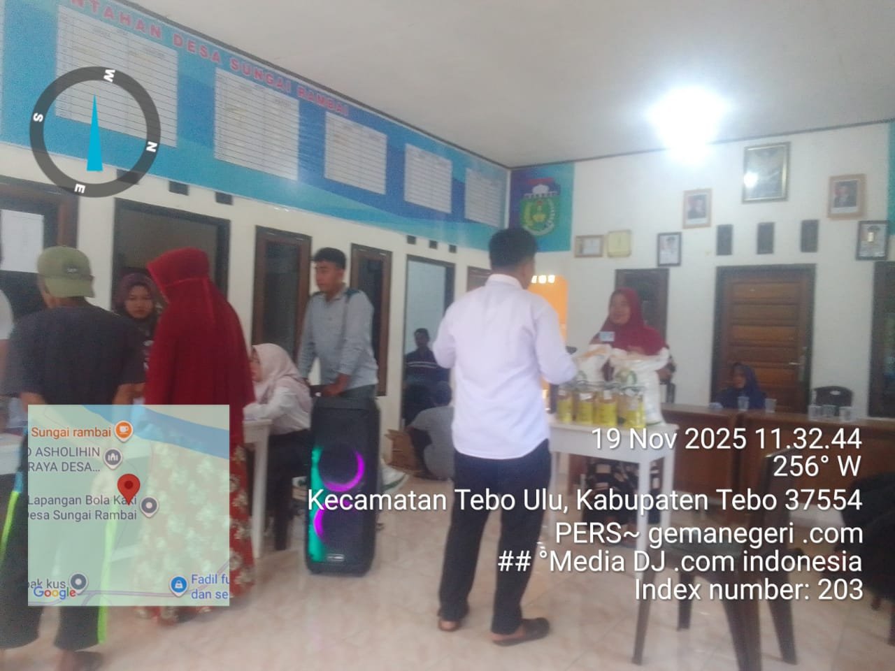 Penyaluran bantuan berlangsung di *Kantor Desa Sungai Rambai*, Kecamatan Tebo Ulu, Kabupaten Tebo, Provinsi Jambi.