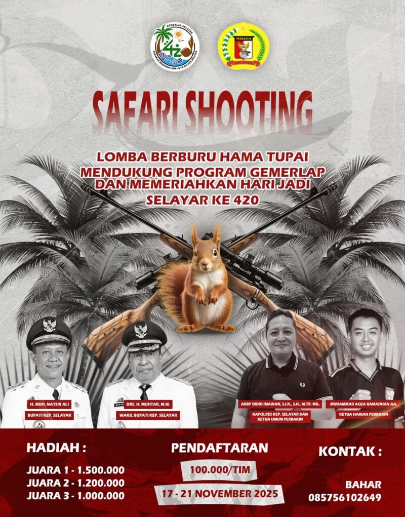Safari Shooting menyiapkan hadiah Jutaan Rupiah dan Pendaftaran dibuka 17–21 November 2025 dengan biaya Rp100.000 per tim. Informasi lebih lanjut dapat diperoleh melalui panitia, Bahar, di nomor 0857-5610-2649.