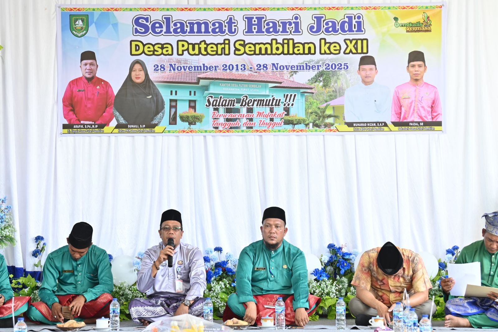 Selain itu, hadir pula Kasi Kessos Kecamatan Rupat Utara, Adi Putra, S.Pd.I., M.A.P, yang memberikan ucapan selamat kepada seluruh warga Desa Puteri Sembilan. Ia mengapresiasi capaian-capaian pembangunan yang telah dilakukan desa dan berharap Puteri Sembilan terus menjadi contoh dalam pengelolaan pemerintahan yang efektif dan harmonis.