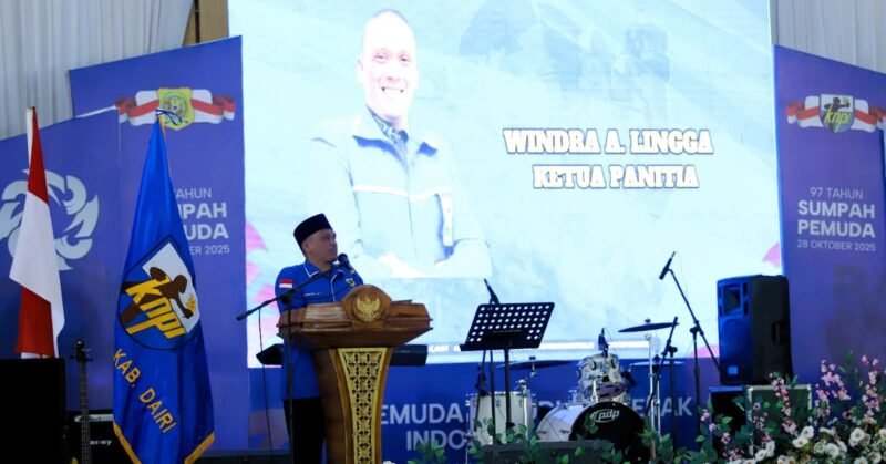 Dairi – Sumut, Mbs – Bupati Dairi, Vickner Sinaga yang diwakili Kepala Dinas Pariwisata Pemuda dan Olahraga (Disparbupora), Rahmat Syah Munthe menghadiri peringatan Hari Sumpah Pemuda ke 97 yang digelar oleh Komite Nasional Pemuda Indonesia (KNPI) Dairi di GOR Sidikalang, Selasa (28/10/2025).