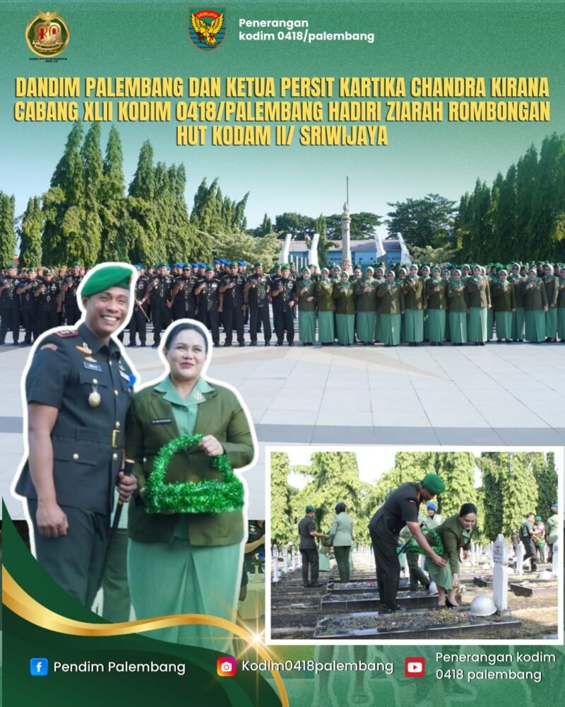 MITRA MABES.COM//Palembang – Dalam rangka memperingati Hari Ulang Tahun (HUT) ke-80 Kodam II/Sriwijaya Tahun 2026, suasana khidmat menyelimuti Taman Makam Pahlawan (TMP) Ksatria Ksetra Siguntang, Palembang, Selasa (13/1/2026). Komandan Kodim (Dandim) 0418/Palembang Letkol Arh Erik Novianto, S.Sos., bersama Ketua Persit Kartika Chandra Kirana Cabang XLII Kodim 0418/Palembang, Ny. Hayu Erik Novianto, turut hadir mengikuti Upacara Ziarah Rombongan.