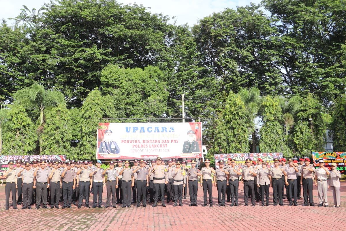 Polres Langkat melaksanakan upacara kenaikan pangkat Perwira, Bintara, dan PNS Terhitung Mulai Tanggal (TMT) 1 Januari 2026. Kegiatan tersebut berlangsung pada Jumat (2/1/2026) pukul 08.20 WIB di Lapangan Jananuraga Polres Langkat dan berjalan dengan khidmat.