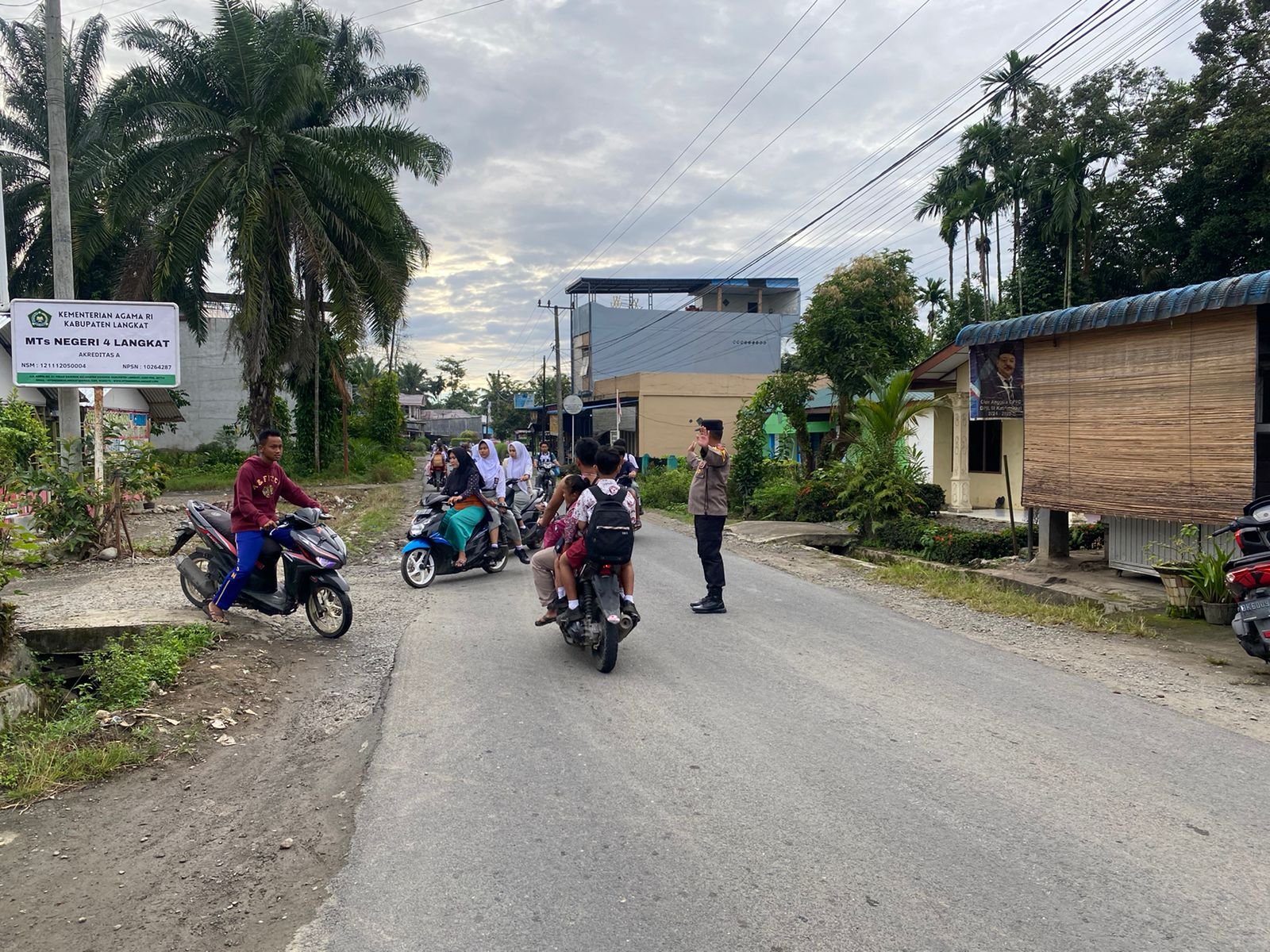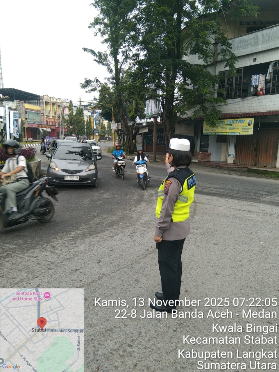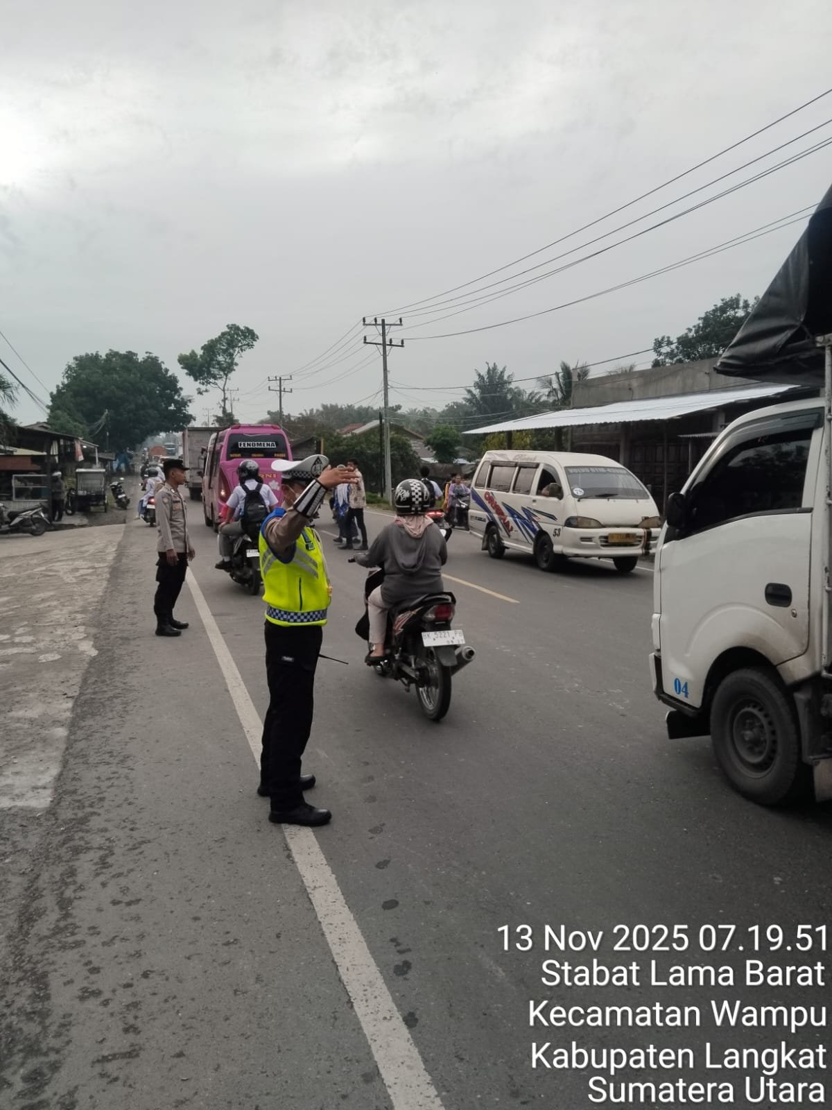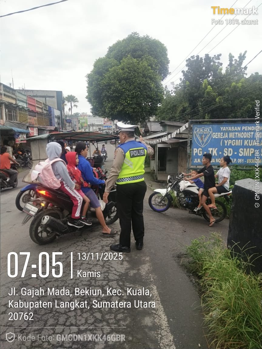 Personil Polres Langkat laksanakan pos padat pagi (strong point) pada titik Lokasi sekolah di pinggir jalan raya, Persimpangan padat lalulintas, Lokasi perkantoran pemkab Langkat, Lokasi rawan kemacetan dan rawan laka lantas di pagi hari, Kamis (13/11/2025).