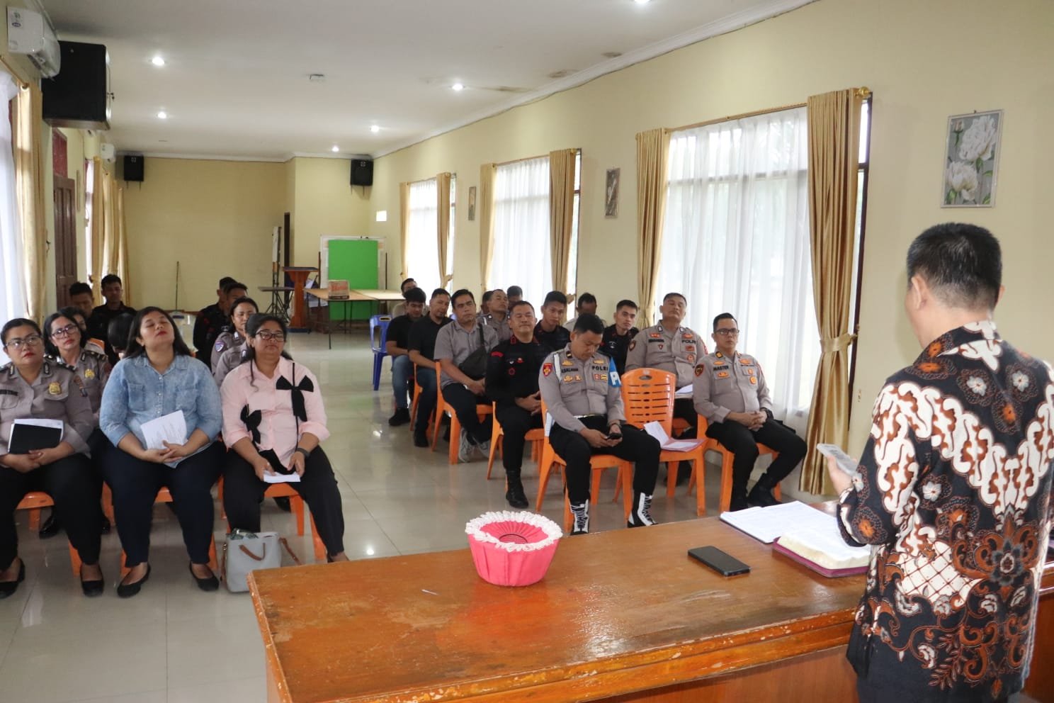 Sementara itu, kegiatan Binrohtal Kristen berlangsung di Gedung Aula Jasmin Polres Langkat, dipimpin oleh Pdt. Budi Kasenda, S.Th., Bapak Gembala. Kegiatan diawali dengan pujian dan penyembahan kepada Tuhan Yesus Kristus, dilanjutkan penyampaian firman Tuhan dari Amsal 27:17 (TB), “Besi menajamkan besi, orang menajamkan sesamanya.” Dalam kotbahnya, Pdt. Budi Kasenda menegaskan pentingnya kebersamaan dan saling menguatkan dalam pelaksanaan tugas dan pelayanan. Ia mengajak seluruh personel untuk saling membangun, meneguhkan iman, serta memperkuat karakter melalui kerja sama dan kasih. Kegiatan juga diisi dengan doa bersama untuk kelancaran Perayaan Natal Polres pada 20 Desember 2025, Hari Natal pada 25 Desember 2025, serta pemulihan masyarakat terdampak banjir.