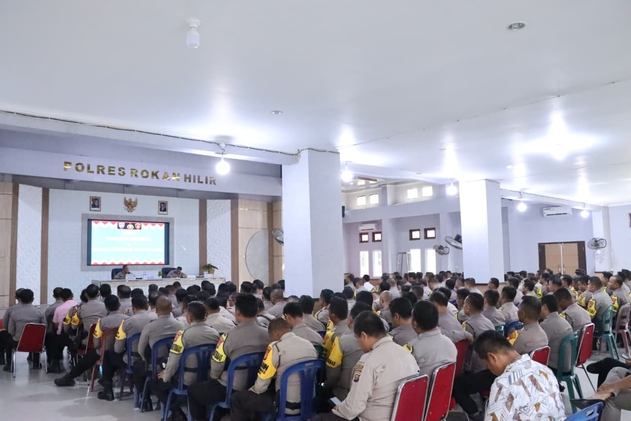 Kegiatan tersebut dipimpin langsung oleh Kapolres Rokan Hilir, AKBP Isa Imam Syahroni, S.I.K., M.H., dan diikuti oleh Wakapolres Rokan Hilir Kompol Rikky Operiadi, S.Sos., S.I.K., M.I.K., para Pejabat Utama (PJU) Polres Rokan Hilir, para perwira, Bhabinkamtibmas, Kanit Intel, serta Kanit Binmas jajaran Polres Rokan Hilir.