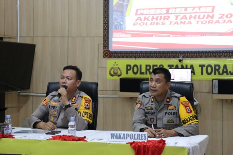 Press release akhir tahun 2025 dipimpin oleh Kapolres Tana Toraja AKBP Budi Hermawan, didampingi oleh Waka Polres dengan memaparkan situasi Kamtibmas selama tahun 2025 dan perbandingan tahun 2024