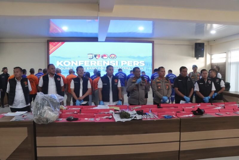 Tanah Karo MBS Com. Polres Tanah Karo menggelar konferensi pers pengungkapan sejumlah kasus menonjol, Jumat (27/9/2025) di Mapolres Tanah Karo. Konferensi pers dipimpin Wakapolres Kompol Gering Damanik, S.H didampingi Kasat Reskrim AKP Eriks Raydikson, S.T, Kasat Narkoba AKP Harjuna Bangun, S.Sos, M.H, serta Kapolsek Simpang Empat AKP Dom Dom Panjaitan.