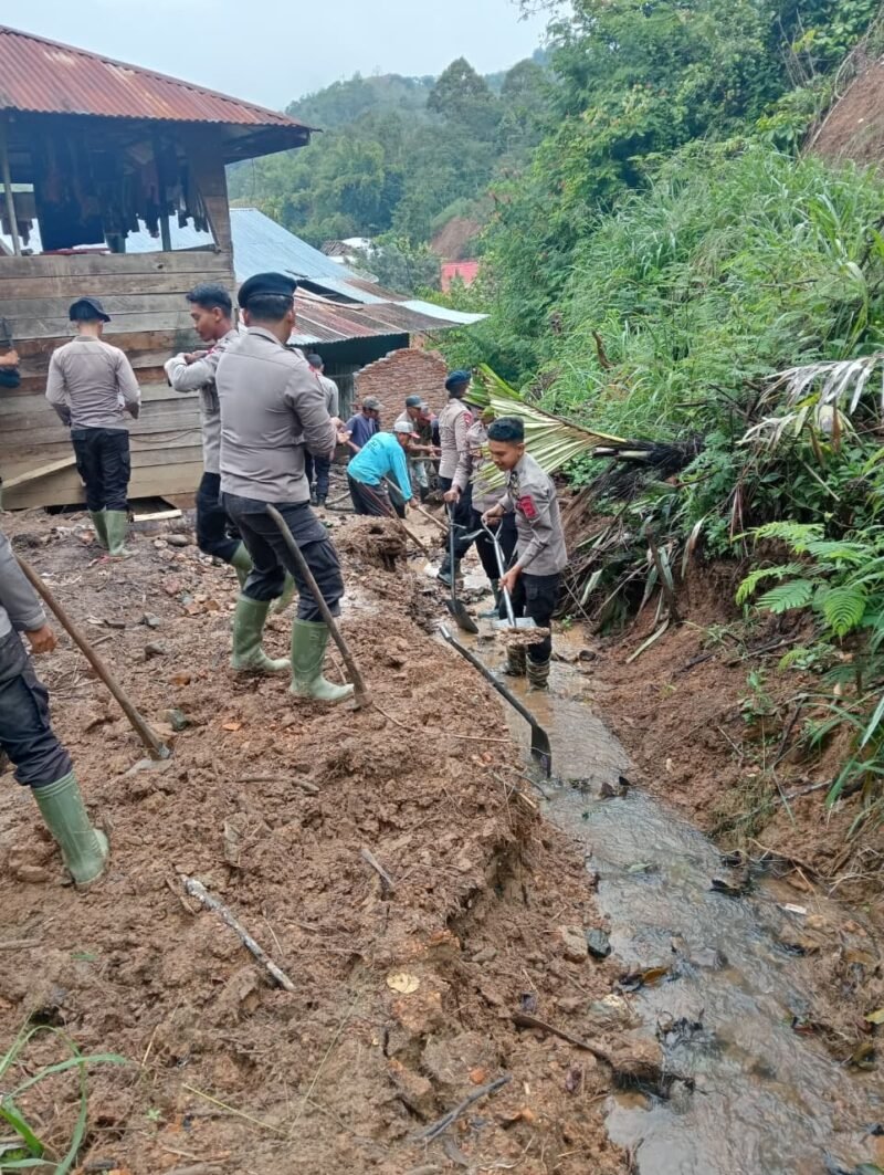 Kepolisian Resor Aceh Tengah melalui personel Polsubsektor Rusip Antara bersama BKO Brimob Polda Aceh melaksanakan gotong royong pembersihan saluran air yang tertimbun material longsor dan kayu pascabencana alam yang terjadi pada 25 November 2025 lalu.