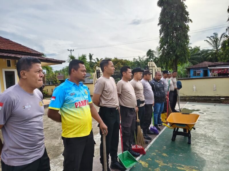 Kubu-Mitramabes.com Polres Rokan Hilir melaksanakan kegiatan gotong royong di Mushola At-Taqwa Polsek Kubu, Senin (16/2/2026) pagi.
