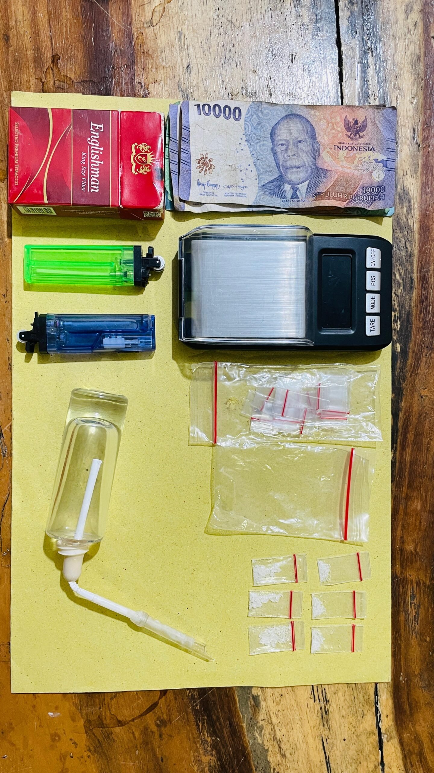 Setibanya di lokasi pada pukul 23.00 WIB, tim melakukan pemantauan dan menemukan seorang pria sedang menggunakan narkotika di dalam rumah. Pelaku langsung diamankan dan diketahui bernama MAULANA, Lk, 37 tahun. Selanjutnya, tim melakukan penggeledahan di lokasi dengan didampingi Kepala Dusun I, Supomo, dan menemukan sejumlah barang bukti yang berada di sekitar pelaku.