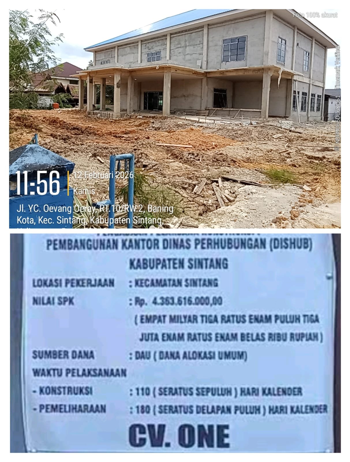 Proyek pembangunan Kantor Dinas Perhubungan Kabupaten Sintang Tahun Anggaran 2025 senilai Rp4,3 miliar yang dikerjakan oleh CV ONE hingga kini menuai sorotan. Pasalnya, pekerjaan yang bersumber dari Dana Alokasi Umum (DAU) tersebut dilaporkan belum tuntas dan dinilai tidak mencerminkan kualitas sebagaimana mestinya.