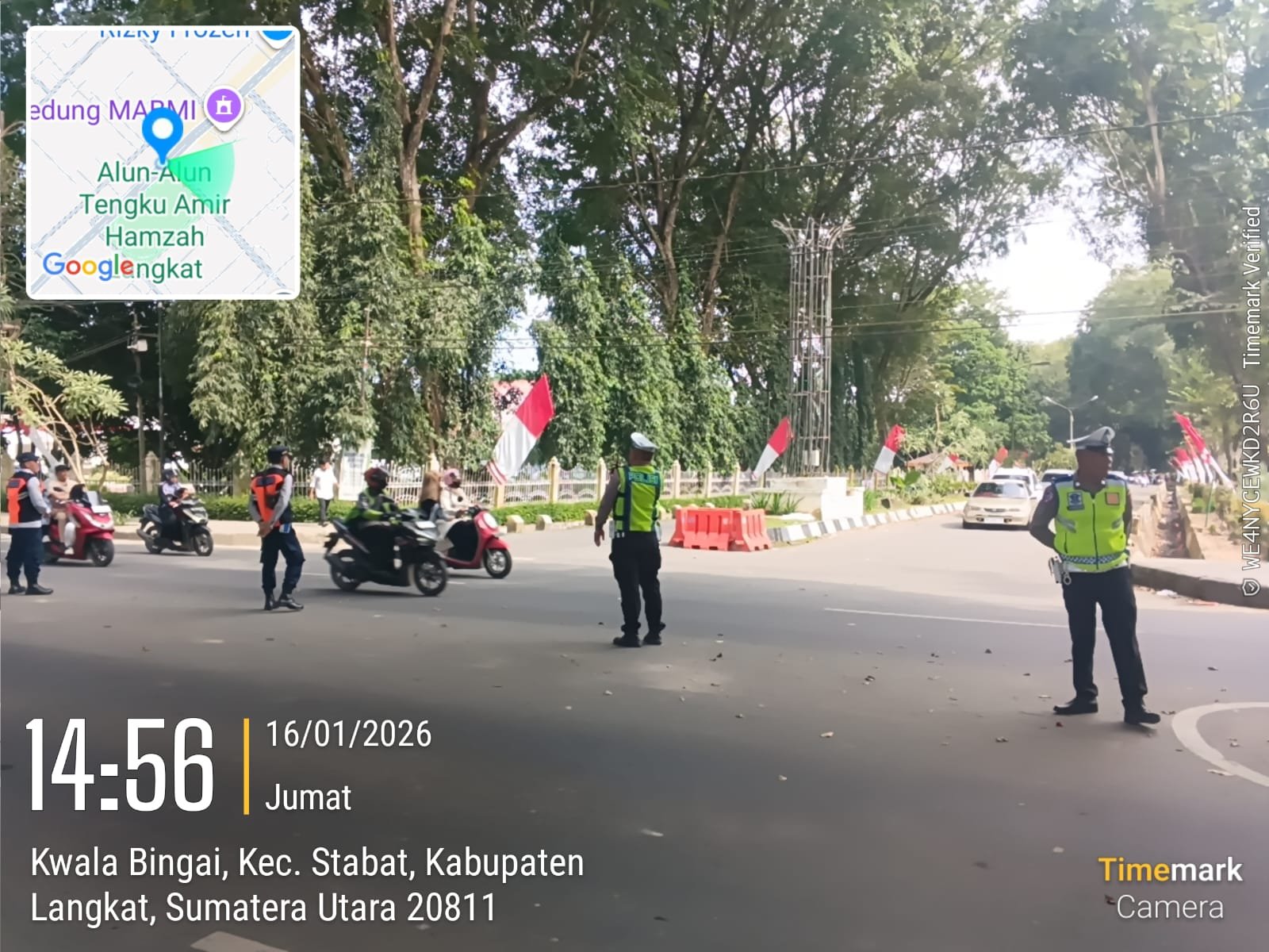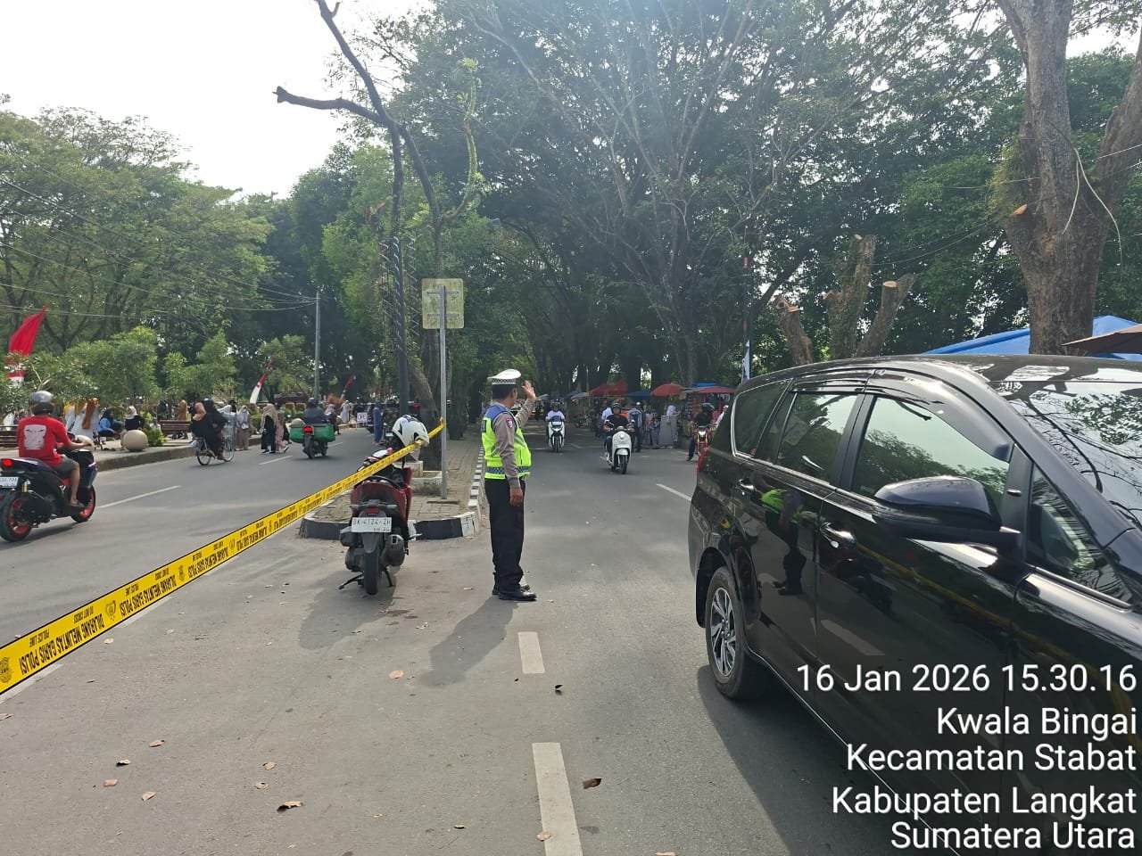 Satuan Lalu Lintas Polres Langkat melaksanakan pengamanan dan pengaturan lalu lintas pada kegiatan tausiyah dan doa bersama yang disampaikan oleh Ustad Das’ad Latif, Jumat (16/1/2026). Kegiatan tersebut digelar dalam rangka memperingati Hari Jadi Kabupaten Langkat ke-276 dan dihadiri masyarakat dalam jumlah besar.