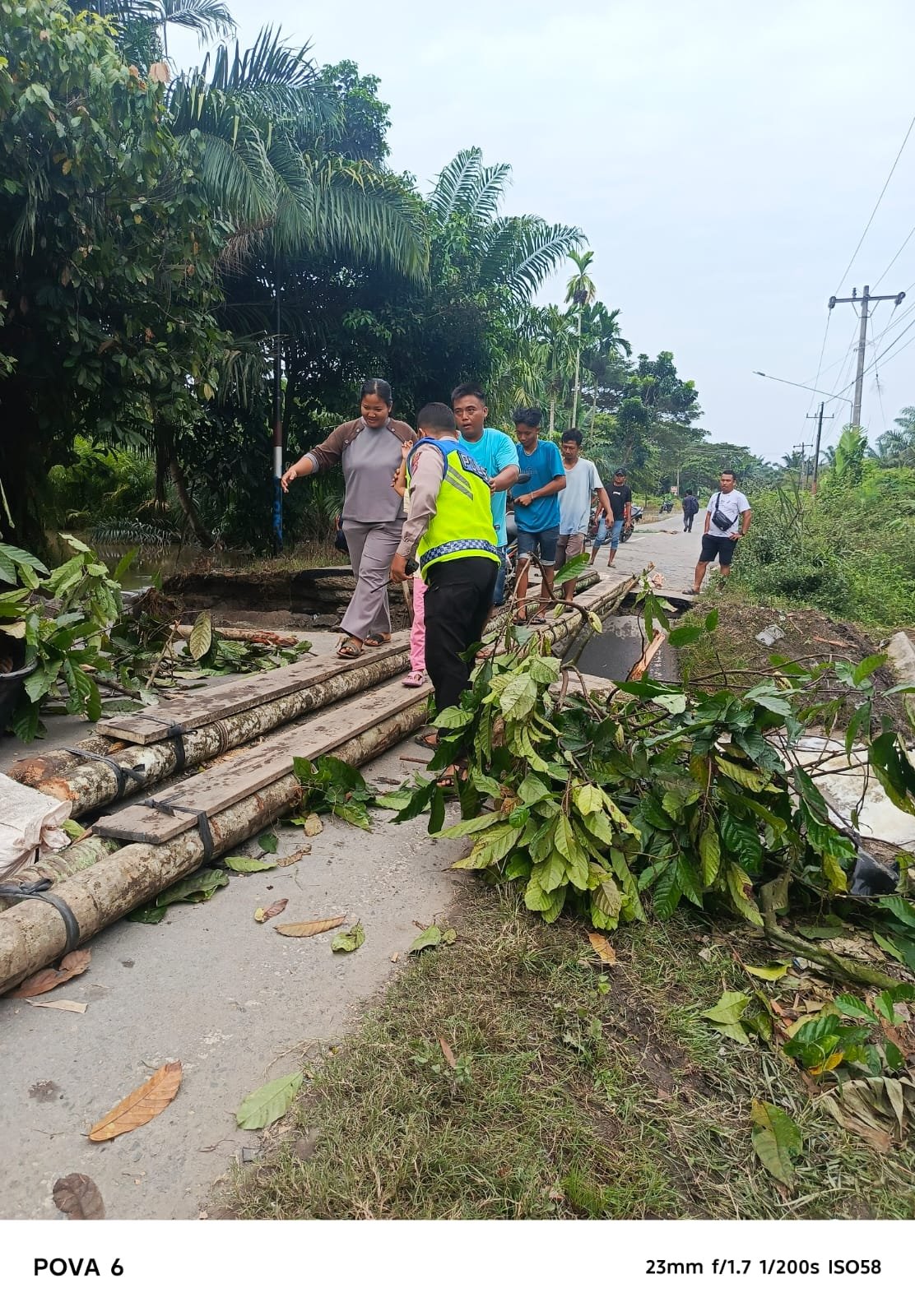 Warga bersama aparat desa saat ini melakukan gotong royong membangun jembatan darurat untuk memfasilitasi pergerakan sepeda motor dengan tetap mengutamakan aspek keselamatan.