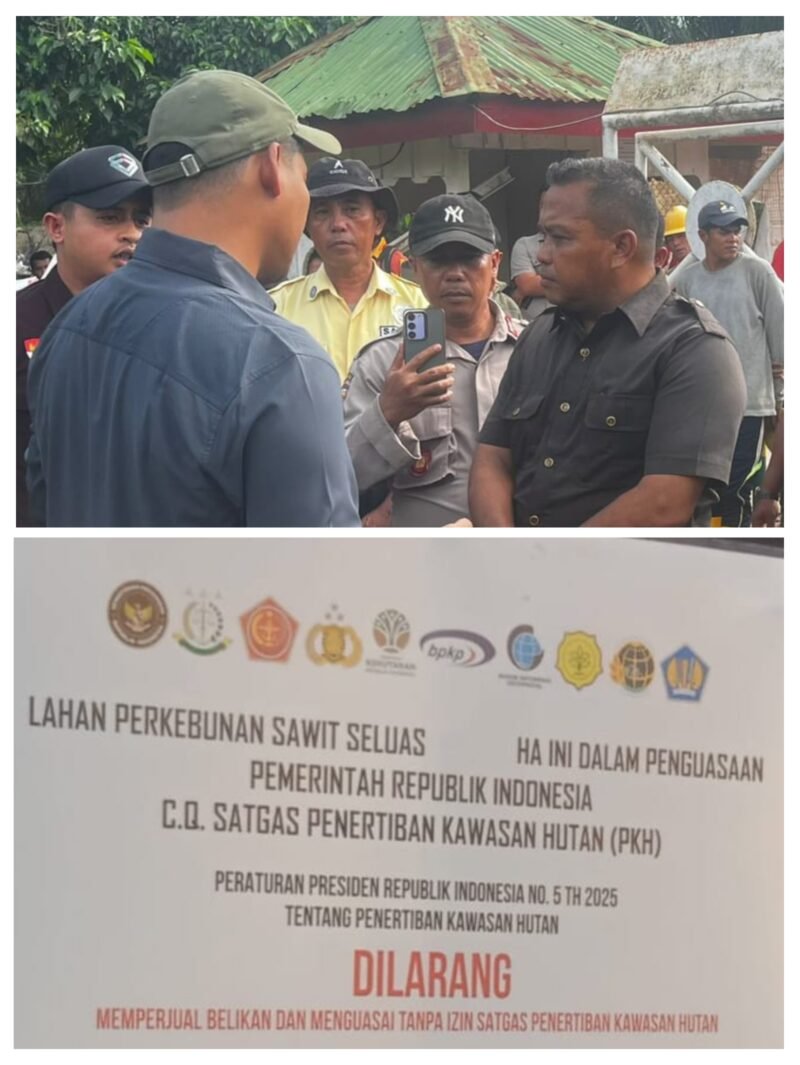 “Lahan Perkebunan Sawit Seluas …. Ha ini dalam pengawasan Pemerintah Republik Indonesia Cq. Satgas Penertiban Kawasan Hutan (PKH) berdasarkan Peraturan Presiden Republik Indonesia Nomor 5 Tahun 2025 tentang Penertiban Kawasan Hutan. Dilarang memperjualbelikan dan menguasai tanpa izin Satgas PKH.”