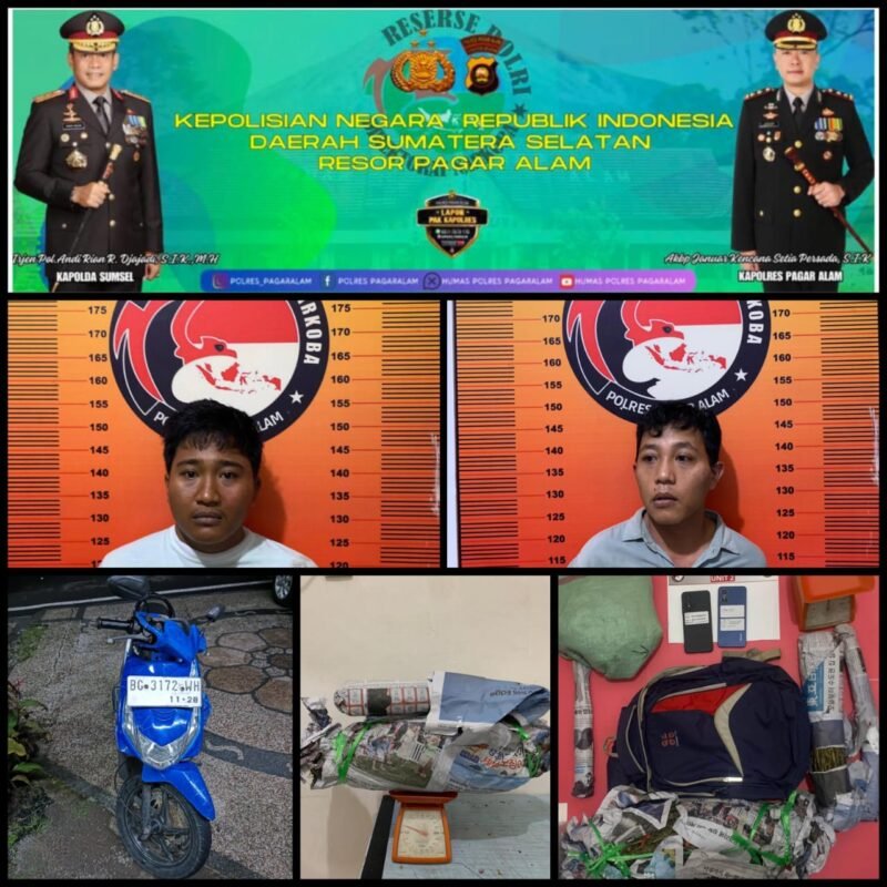 Satresnarkoba Polres Pagar Alam berhasil mengungkap kasus tindak pidana narkotika jenis ganja dengan total barang bukti 1.700 gram, serta mengamankan dua tersangka yang merupakan kakak beradik, setelah menindaklanjuti laporan masyarakat. Pengungkapan ini dipimpin Kasat Narkoba Iptu Doris Pidriandi SH atas arahan Kapolres Pagaralam AKBP Januar Kencana Setia Persada S.Ik didampingi Kasi Humas Iptu Mansyur SH.