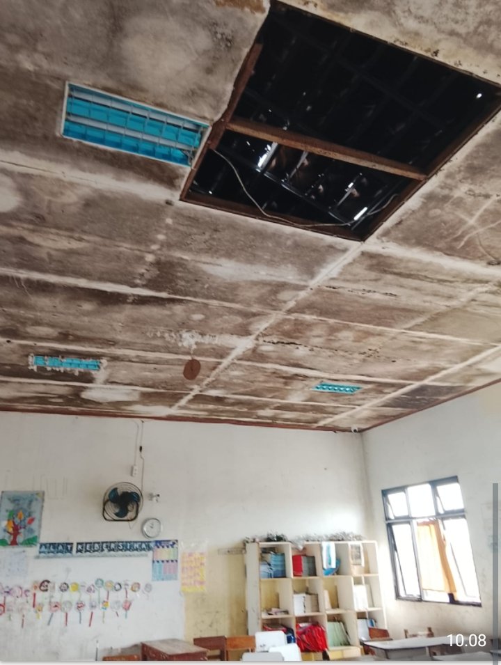 Menurut keterangan orang tua siswa itu sudah terjadi dari lama pak,apalagi sekarang musim hujan anak anak kehujanan di dalam kelas, ditambah lagi asbes ruangan sudah keropos,bisa bahaya kalau ketiban bagaimana, kata salah seorang orang tua murid.