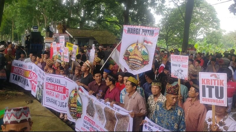 Pesawaran, MBS Masyarakat Adat Marga Way Lima menggelar aksi demonstrasi menuntut pengembalian tanah ulayat adat Way Lima yang hingga kini masih dikuasai PTPN I Regional 7 Unit Way Lima, meskipun kontrak penguasaan tanah oleh perusahaan perkebunan Belanda telah berakhir sejak tahun 1940.