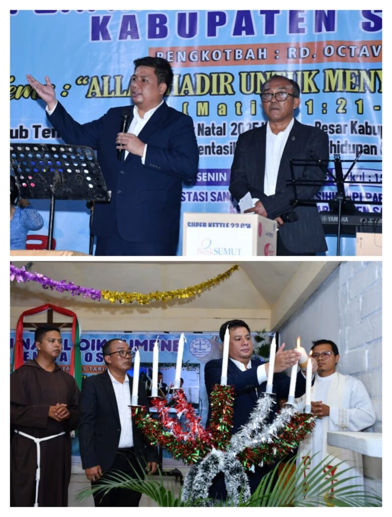 Samosir – Sumut, Mbs – Perayaan Natal Oikoumene Kabupaten Samosir 2025 berlangsung penuh haru di Gereja Katolik Stasi Santo Markus Sihusapi, Kecamatan Simanindo, Senin (29/12/2025). Meski berada di daerah terpencil dan berukuran kecil, seluruh rangkaian ibadah berjalan khidmat. Tema Natal tahun ini, “Allah Hadir Untuk Menyelamatkan Keluarga” dengan subtema mewujudkan Samosir Unggul melalui keselamatan dan implementasi iman dalam kehidupan.