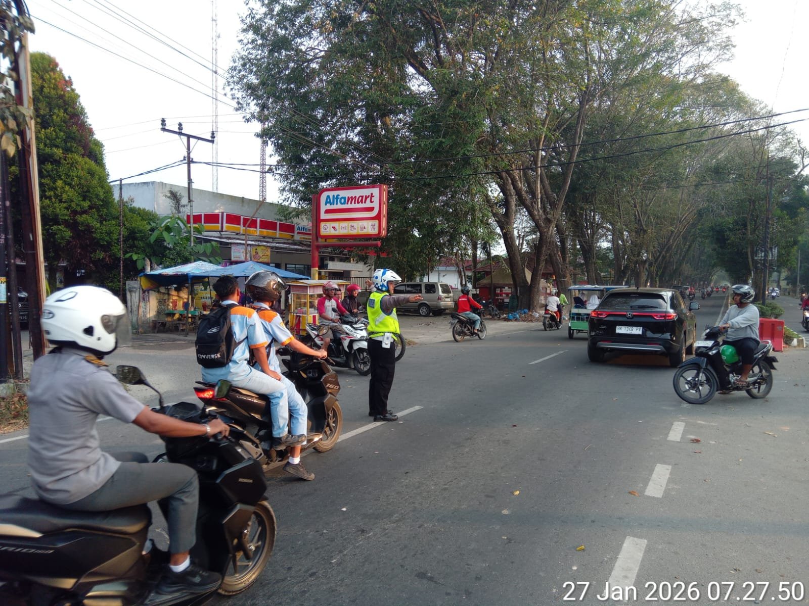 Kegiatan ini difokuskan pada pengamanan dan pengaturan lalu lintas di titik-titik keramaian, khususnya di sekitar sekolah-sekolah, persimpangan padat, pasar, serta jalur utama aktivitas masyarakat pada jam sibuk pagi hari.