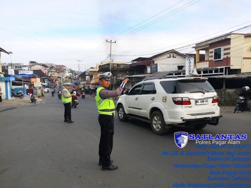 Pagaralam – Satuan Lalu Lintas Polres Pagar Alam melaksanakan kegiatan strong point pagi pada Selasa (3/3/2026) di bulan suci Ramadhan 1447 Hijriah. Kegiatan ini dipimpin Kasat Lantas AKP Herman. SH bersama personel Satlantas.