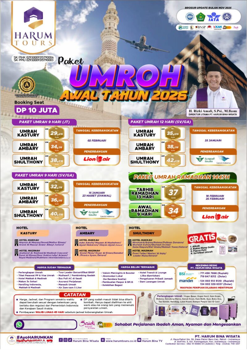 MBS Indramayu, -PT Harum Bina Wisata atau dikenal dengan PT Harum Tours kembali memberikan pelayanan yang terbaik buat para jamaah umroh dan haji yang ingin terbang ke tanah suci persama travel andalan yakni Travel Harum Tours yang membawa anda dan keluarga anda menunaikan ibadah umroh Dan haji. Travel Harum Tours sendiri Beralamatkan di Jl. Raya Patrol No.36, Desa Patrol Baru,Kecamatan Patrol Kabupaten Indramayu, Kamis (2201/2026)