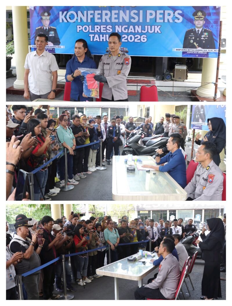 Mitramabes.com – Nganjuk – Satreskrim Polres Nganjuk menggelar konferensi pers pengungkapan kasus tindak pidana pengroyokan dan atau penganiayaan yang mengakibatkan satu korban meninggal dunia. Konferensi pers tersebut dilaksanakan di Joglo Polres Nganjuk, Kamis (29/01/2026).