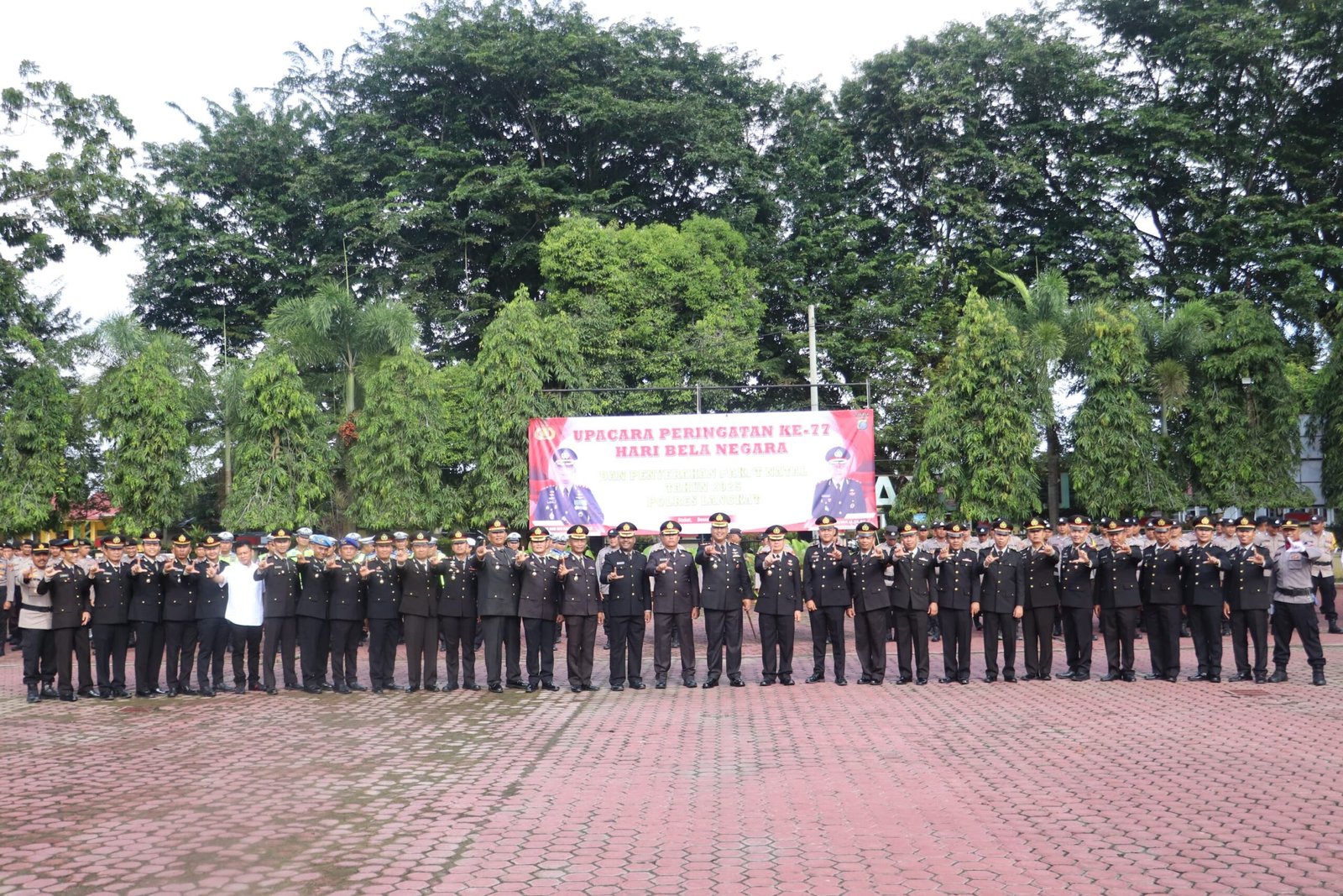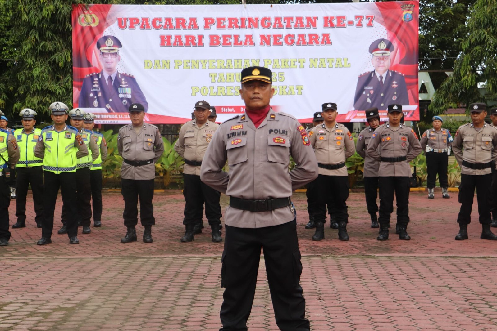 Polres Langkat melaksanakan Upacara Peringatan Hari Bela Negara ke-77 yang dirangkaikan dengan penyerahan paket Natal Tahun 2025, bertempat di Lapangan Upacara Jananuraga Polres Langkat, Senin (19/12/2025).