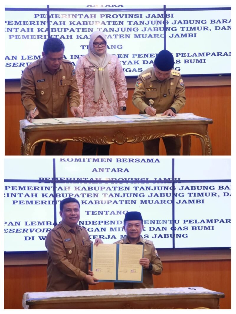 Mbs.com- Jambi, Tanjung Jabung Barat- Wakil Bupati Tanjung Jabung Barat, Dr. H. Katamso, S.A., S.E., M.E., menandatangani komitmen bersama antara Pemerintah Provinsi Jambi dengan Pemerintah Kabupaten Tanjung Jabung Barat, Kabupaten Tanjung Jabung Timur, dan Kabupaten Muaro Jambi. Komitmen tersebut berkaitan dengan Penetapan Lembaga Independen Penentu Pelamparan Reservoir Cadangan Minyak dan Gas Bumi di Wilayah Kerja (WK) Migas Jabung dan Migas Lemang, Selasa (4/11).