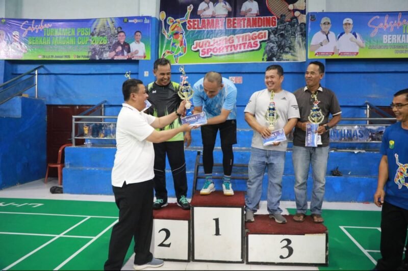 TANJAB BARAT ,– Mitra Mabes.com – Wakil Bupati Tanjung Jabung Barat, Dr. H. Katamso, SA, S.E., M.E., didampingi Ketua Gabungan Organisasi Wanita (GOW) Kabupaten Tanjung Jabung Barat Marina Septiani Katamso, S.IP., secara resmi menutup sekaligus menyerahkan piala kepada para juara Turnamen Bulutangkis Berkah Madani Cup Tahun 2026 yang digelar di GOR Bulutangkis Kuala Tungkal, Kamis malam (29/01).